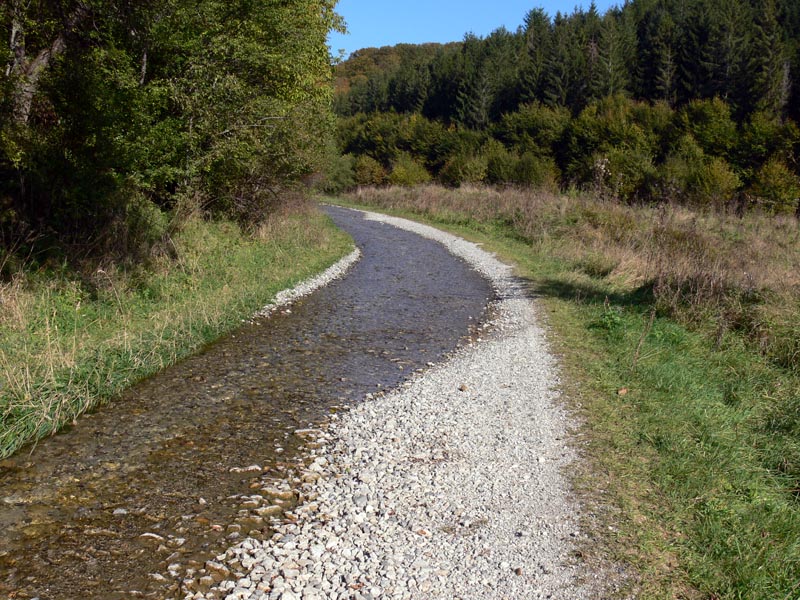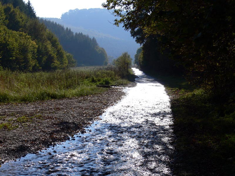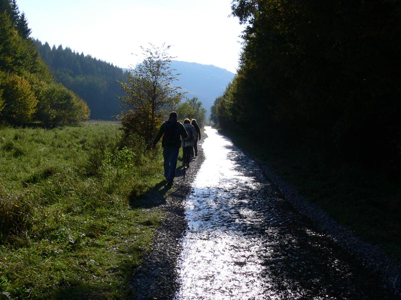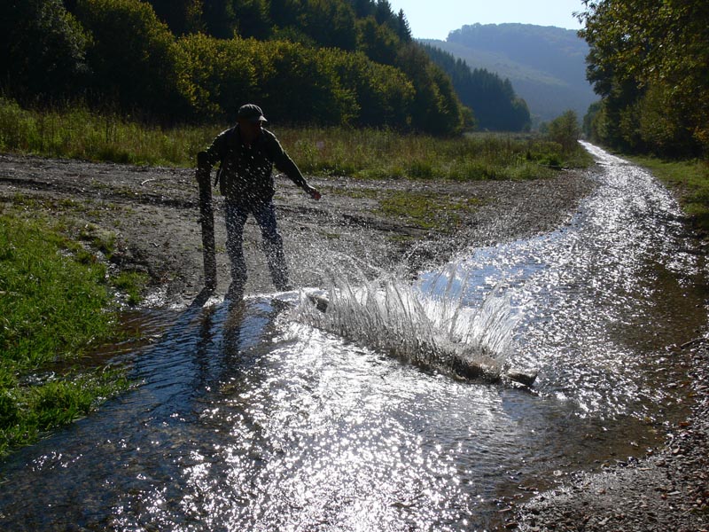 Répáshutáról tartottunk 2010-ben a romantikus és borzongató kisugárzású Gyertyán-völgyi üveghuta romjaihoz (és vissza) egy szikrázóan napos de hideg - éjszaka fagyott is - szeptember végi napon. Egészen egyedi hangulata volt az útnak, a az előző napok esős időjárása folytán az egykori murvás országút bővizű patakká változott. A narancssárgán, kissé lapos szögből tűző nap nem csak a fényképezőgép fénymérőjét bolondította meg, hanem a szemünket is: jócskán hunyorogtunk egész úton, különösen visszafelé, amikor szemből kaptuk a sugarakat. Nagyszerűen éreztük magunkat, élveztük hogy számtalanszor át kellett kelnünk az útból lett patakon - ez hol így, hol úgy sikerült... Igazi remek alkalom volt néhány órára megfeledkezni a mindennapokról; az ilyen emlékek felidézésekor aligha csak nekem jut eszembe: mikor megyünk legközelebb ?