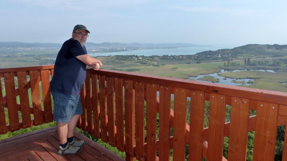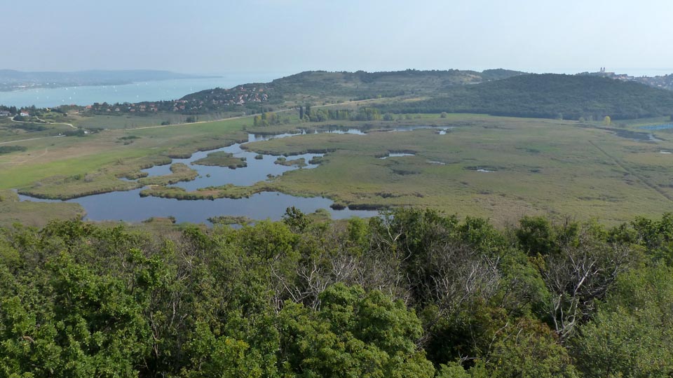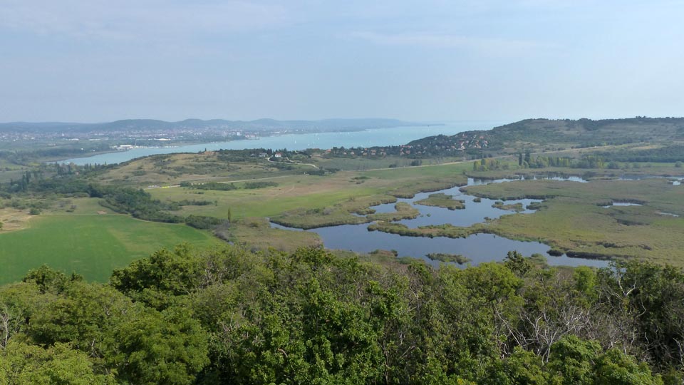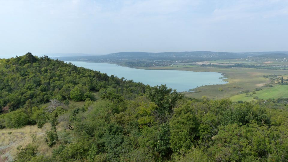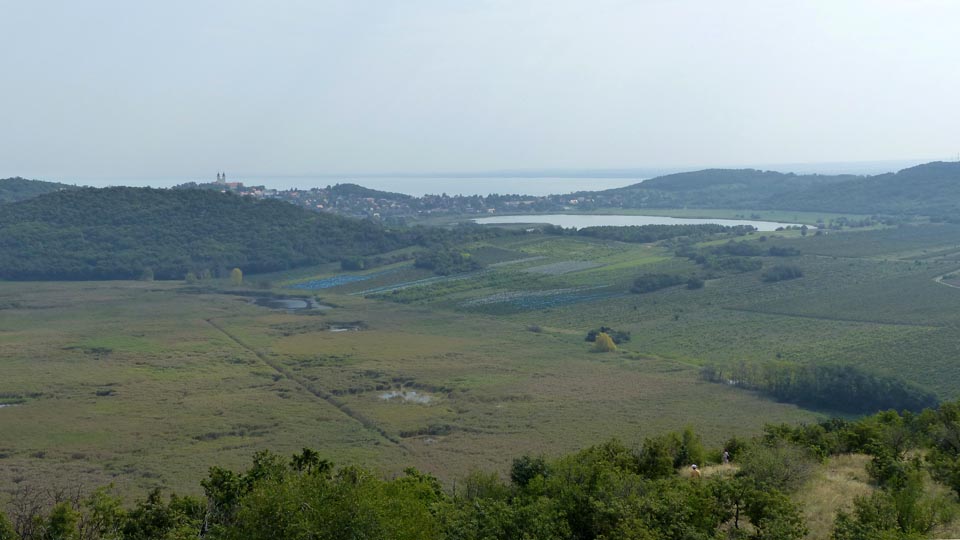 Jó sok Balaton-környéki kilátóról (gombamód szaporodnak, nagy örömünkre) leírtam már hogy "egészen kivételes látvány" nyílik róla. Nem tudom mit mondjak akkor az Apáti-hegyen lévő kilátóról, ha nem akarok ismétlésekbe bocsátkozni. Inkább azt írom, hogy mikor ott jártunk (2016. szeptember elején) még nem is létezett. Értsd ez alatt, hogy nem volt átadva, sőt, építési területként be volt kerítve. "Jó magyar embernek" persze ez nem akadály - voltunk szép számmal, akik a kerítésen átbújva, az építési anyagokon átbukdácsolva másztunk fel a már kész lépcsőkön, ki a kisgyerekét, ki a nagymamáját húzva-vonva. Ha a képeket elnézed, talán megbocsájthatónak tartod az illetéktelen behatolást. Nézd meg az előtérben a Külső-tavat, mögötte a Füredi-öblöt mutató panorámát - nem is gondolnád hogy Magyarországon van! Vagy csodáld meg a Külső-tó náddal szabdalt vízfelületét - tudtad hogy kétszáz éve lecsapolták, és legelőként használták? Csak az 1970-es évek végén rehabilitálták, elzárva a vízleeresztő csatornákat. Azóta a vízi élővilág visszahódította, vízimadarak, teknősök, halak és kitudja miféle ritka jószágok vették birtokba. Ember persze nem teheti be a lábát ide. Vedd észre az egykori hatalmas vulkáni krátert, amelyben az összegyűlő esővíz (merthogy források itt nincsenek!) hozta létre a Külső- és a horgászparadicsommá vált, nyílt vizű Belső-tavat. Gyönyörködj az Apátság templomában, ami minden irányból gyönyörű, de ebből a szögből csak kevesen látják. Nyugat felé nézve a Sajkodi-öblöt látod, előtérben a Csúcs-hegy, háttérben Örvényes és Balatonudvari. Azt is elmondom hogy hogyan jutsz a kilátóhoz: az Apáti-templomromtól (a Füred-Aszófő közötti út mellett van, a sajkodi elágazásnál) jelzett turistaösvény vezet ide, húsz perc lankás emelkedő, némi kaptatóval fűszerezve. Mire Te arra jársz, már biztosan átadják a kilátót !
