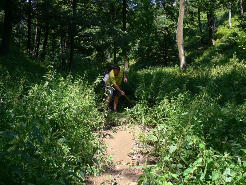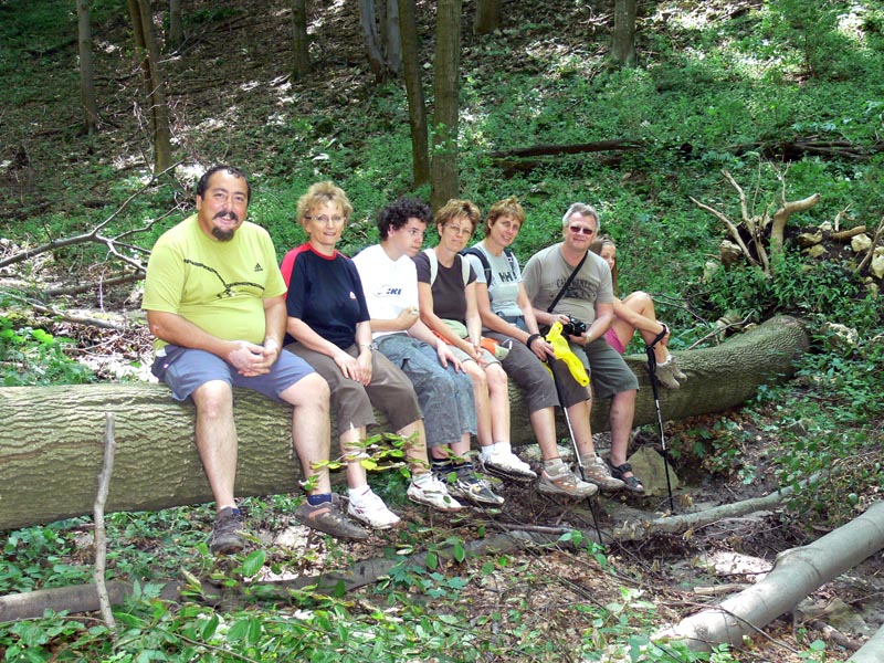 Hát, a 2009-es Fehér-kő árok béli túra inkább az első kategóriába sorolható... A fene tudja hányszor kellett a megduzzadt patakon átugrálni, aztán a keskeny völgyben lehetett választani: a tegnapi eső miatt nyakig érő sárba, vagy fülig érő csalánba (esetleg mindkettőbe) gázolj. Az ösvényen keresztbe dőlt fák, pontosan olyan magasságban, hogy alatta vagy felette egyformán kényelmetlen volt átbújni. Az ember törölgeti a szemét, hogy "ide hogy' a fenébe kerültünk...?" Az első óra keservei után a dolog átcsapott vidámságba, az ember kínjában már nevetett - aztán már nem kínjában, hanem jókedvében. Minden jóra fordult, még csoportos fényképezkedésre is futotta az erőből. Az utolsó képen a hazavezető úton a menyecskék már pihentetik azt az izmukat, ami egyébként hallatlanul erős - de nagy szükség is van rá !