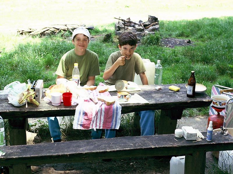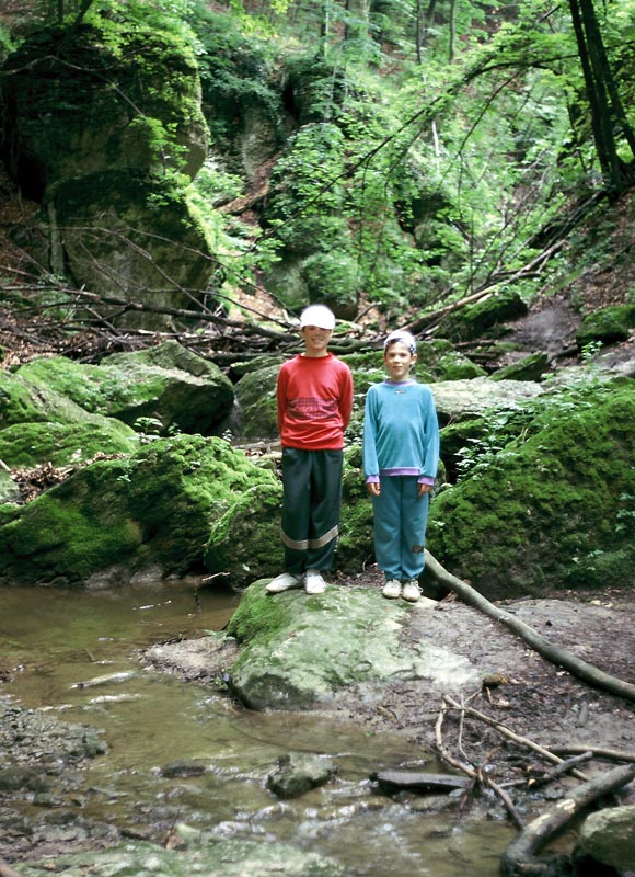A Bakonybélt Pápával összekötő festői völgyben kanyargó út mentén vagyunk, a hajdanvolt Gerence-csárda akkor még meglévő romjával csaknem átellenben. Ezen a helyen ha jól számolom négy különböző alkalommal töltöttünk néhány éjszakát. Itt éppen 1995-öt írunk, októberre várjuk harmadik csemeténk születését - a nejem elküldött minket otthonról a Bakonyba sátorozni, hogy az ebbéli jókban a két "nagy" fiunk (meg én) ne szenvedjünk hiányt. Remekül éreztük magunkat, túra egy szűk szurdokban, őskövületek keresésé (és találása), sátorverés az erdőben. A fiúk a patakban saraztak, utána autentikus tálalású ebéd, este az elmaradhatatlan tábortűz - mi kellhet még? Na jó: Anya azért egy kicsit hiányzott...