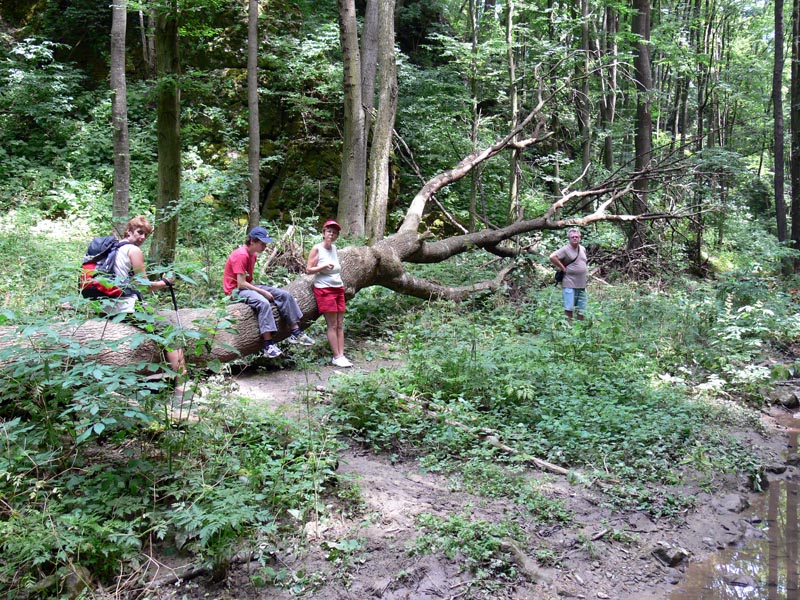 Hát, ez a szurdok - ahogy valamirevaló szurdokhoz illik - jól el van dugva ! Bakonybélből pl. egy nem túl jól felfestett turistaúton egy jó óra ideérni - de megéri. Meredek sziklás völgyfalak között kanyarog a patak, szokás szerint sokszor át kell rajta kelni (a hideg lábfürdő szinte elkerülhetetlen). A keresztben bedőlt fák külön színesítik a közlekedést. A völgy oldalában meredek ösvényen lehet felkapaszkodni az Oltár-kőhöz, ahonnan remek kilátás nyílhatna a völgyre, ha az erdészet kiirtaná az előtte mindent eltakaró fákat (szerencsére nem teszi). Aki szomjas, ihat a Judit-forrásból, bár érdekes technikát igényel - ahogyan az utolsó képen Sanya bemutatja...