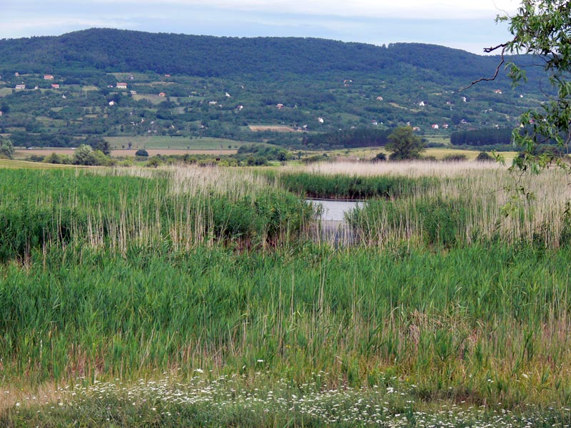 Panoráma a Hegyes-tű oldalából nézve. A tó a kép közepén lévő élénkzöld sáv - a nádas.